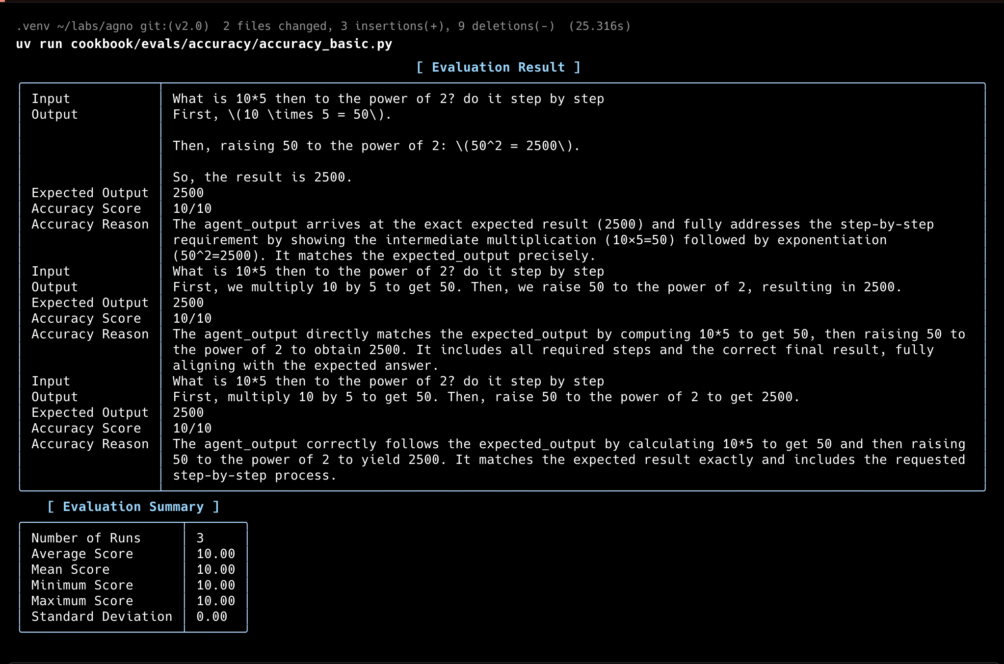 In this example, theAccuracyEval will run the Agent with the input, then use a different model (o4-mini) to score the Agent’s response according to the guidelines provided.